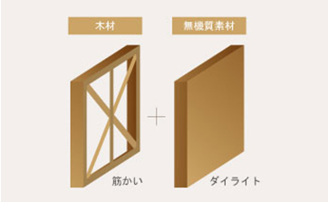 ミオポルトでは、筋かいに加えダイライトというすぐれた耐力面材を併用し、強度を含めさまざまな構造的性能を高めています。無機質素材のため、燃えにくく耐火性にすぐれ、また、通気性も備わっているため結露を防ぎ内部からの劣化を防ぎます。